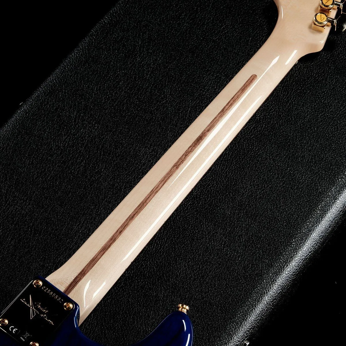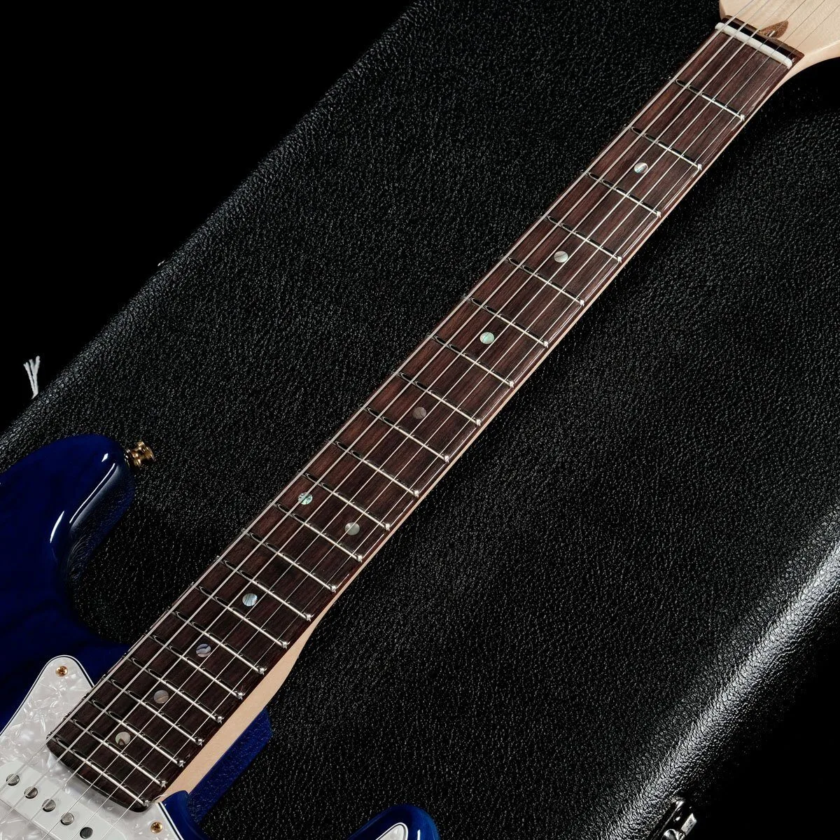 Custom-built Custom Stratocaster HSS in NOS Cobalt Blue Transparent. This custom-built HSS Stratocaster features a 2-Piece Ash body with a urethane finish and a quarter-sawn maple neck. The fingerboard is flat-laminated rosewood. The neck shape is a ’60s-style oval “C” shape, with a 12″ radius and 6100 jumbo 22-fret fretboard. The HSS pickups are Custom Shop ’65 Strat single-coil pickups in the neck and middle positions, and a Seymour Duncan TB4 pickup in the bridge position.