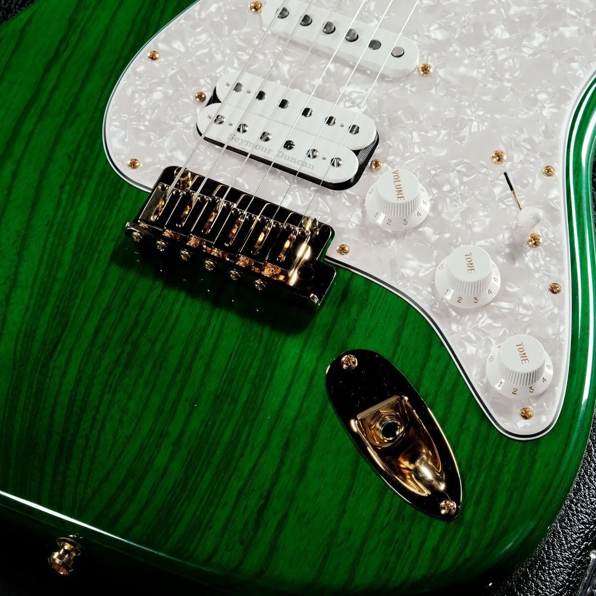 Custom-built HSS Stratocaster in NOS Emerald Green Transparent. This custom-built HSS Stratocaster features a 2-Piece Ash body with a urethane finish and a quarter-sawn maple neck. The fingerboard is flat-laminated rosewood. The neck shape is a ’60s-style oval “C” shape, with a 12″ radius and 6100 jumbo frets for 22 frets. The HSS pickups are Custom Shop ’65 Strat single-coil pickups in the neck and middle positions, and a Seymour Duncan TB4 pickup in the bridge position.