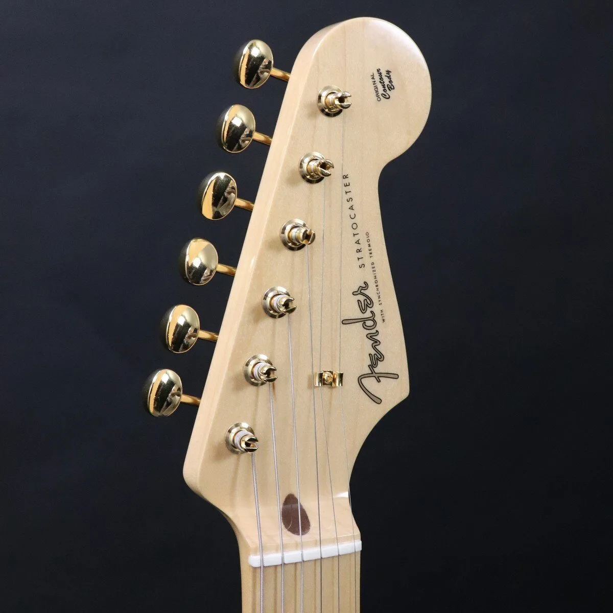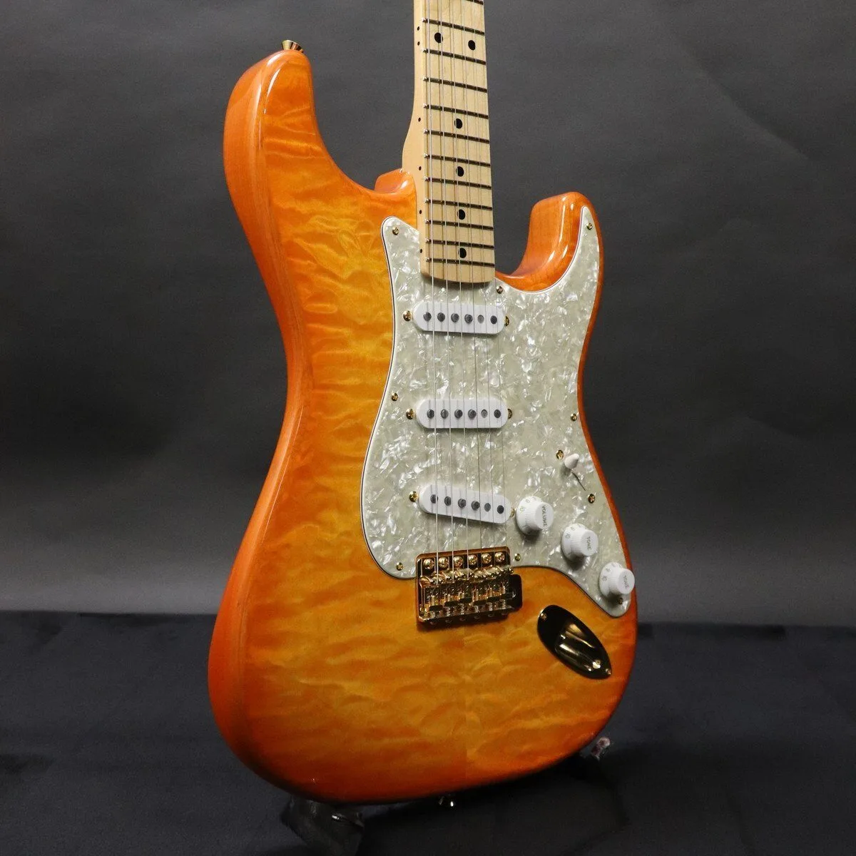 appearance, performance, and sound. The “C”-shaped neck, 9.5-inch-radius fingerboard, and medium jumbo frets provide smooth playability. The “Gold 6-Saddle Vintage-Style Synchronized Tremolo” bridge delivers a traditional Strat sound. The pickups, notably the “ISHIBASHI FSR” pickups, feature the USA-made ’57/’62 Strat Pickup Set, which has been featured on some models since last year! These pickups deliver a bright, transparent tone thanks to Formvar magnet wire, developed through analysis of an authentic 1963 Stratocaster. Their relatively flat acoustic characteristics make them easy to tailor with an effects amp. You’ll enjoy a more powerful sound than a standard Made in Japan Strat. This is a limited edition, sold exclusively by Ishibashi. Be sure to consider it soon! ■Weight: 3.33kg ■JAN: 0717669909130 ■Accessories: Arm, Manufacturer’s Warranty: 1 year Model: ISHIBASHI FSR MIJ Traditional 50s Stratocaster Quilted Maple Top Ash Back Honey Burst Color: Honey Burst Body: Ash / Quilt Neck: Maple Neck Finish: Gloss Urethane Neck Shape: “C” Shape Scale: 25.5 Fingerboard: Maple Fingerboard Radius: 9.5 Fret number: 21 Fret Size: Medium Jumbo Nut: Bone Nut Size mm: 42 Position Inlay: Black Dots Bridge Pickup: 57/62 Strat Middle Pickup: 57/62 Strat Neck Pickup: 57/62 Strat Control: Master Volume, Tone 1. (Neck Pickup), Tone 2. (Bridge, Middle Pickup) Pickup Switch: 5-Position Blade Pickup Configuration: SSS Bridge: 6-Saddle Vintage-Style Synchronized Tremolo Hardware Finish: Gold