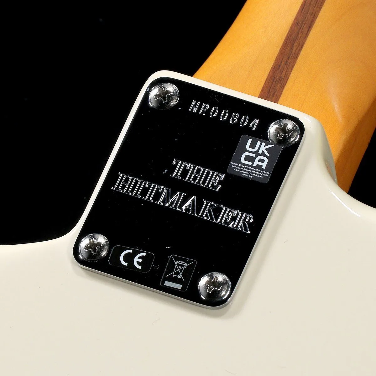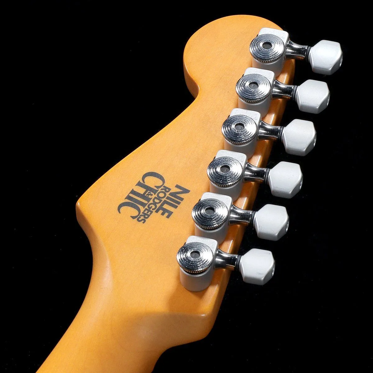 Nile Rodgers Hitmaker Stratocaster boasts a uniquely smaller size than a typical vintage Stratocaster, with a deeper contoured alder body in a 1960s shape. The beautiful Olympic White lacquer finish is the same finish Nile sprayed on the guitar shortly after acquiring it in the early days of his funk-disco band, Chic. The custom ’59-profile, one-piece maple neck features a satin finish, a 9.5-inch-radius fingerboard, and medium-jumbo frets. The back of the headstock features the “Nile Rodgers & Chic” logo, and the neck plate is engraved with the Hitmaker logo.