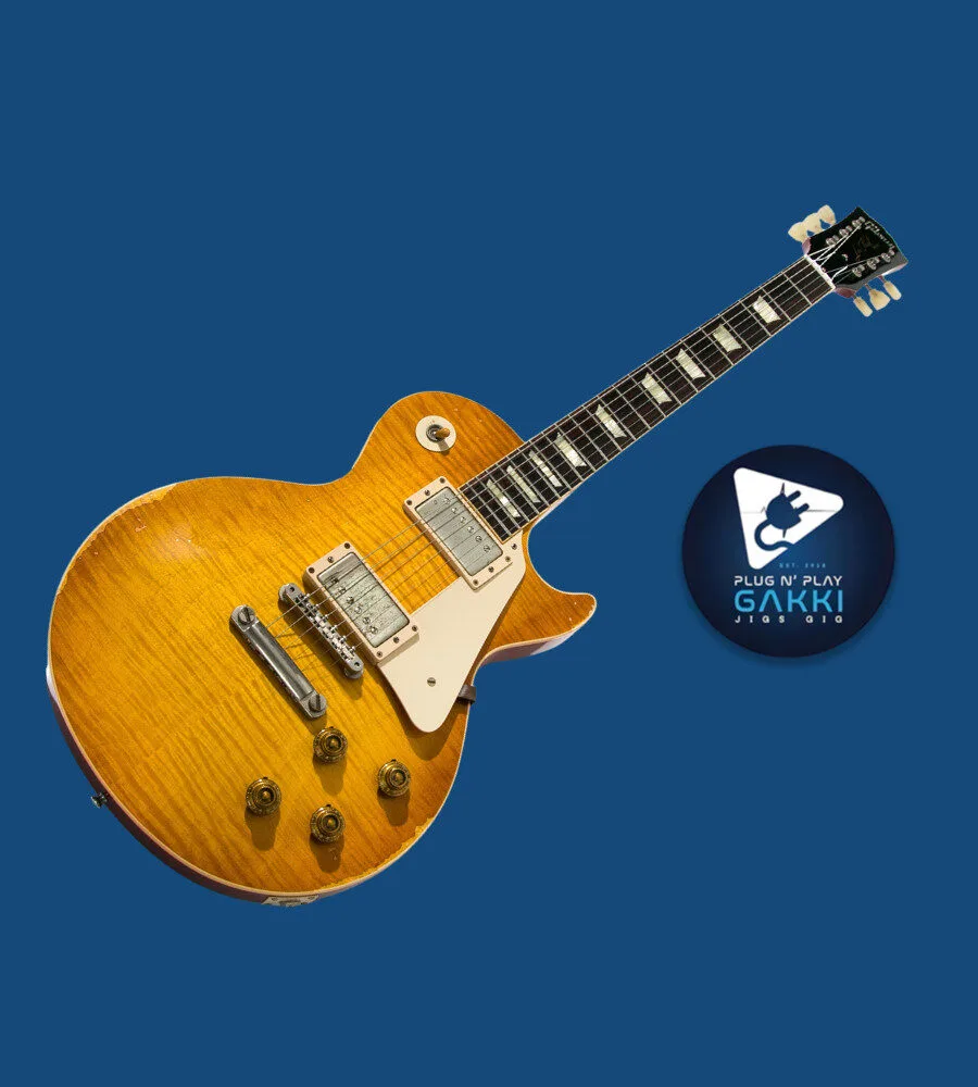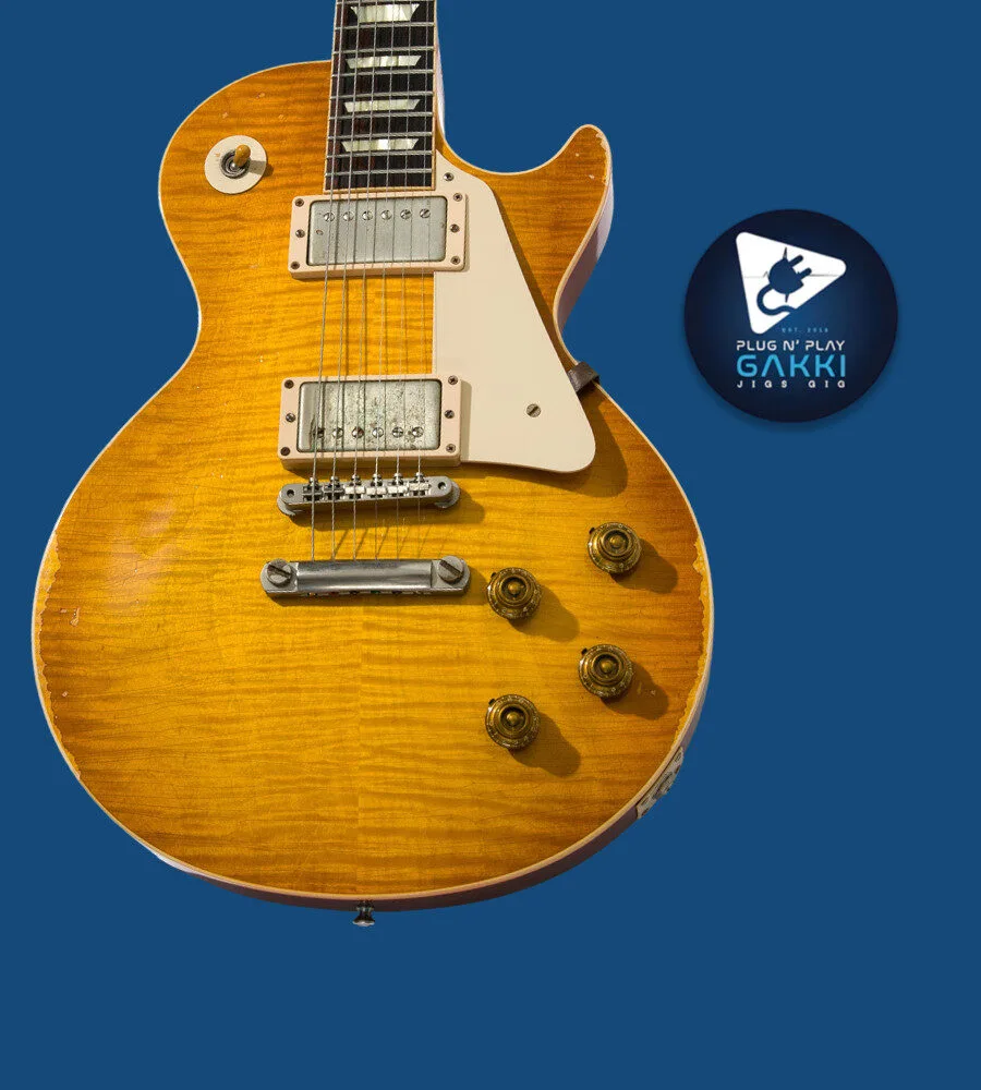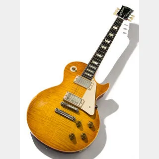 This is a Gibson Custom Shop Hand Select Historic Collection 1959 Les Paul Reissue Heavy Aged Double Dirty Lemon, which is lightweight at 3.8 kg and uses selected 1-Piece Mahogany for the body and neck.