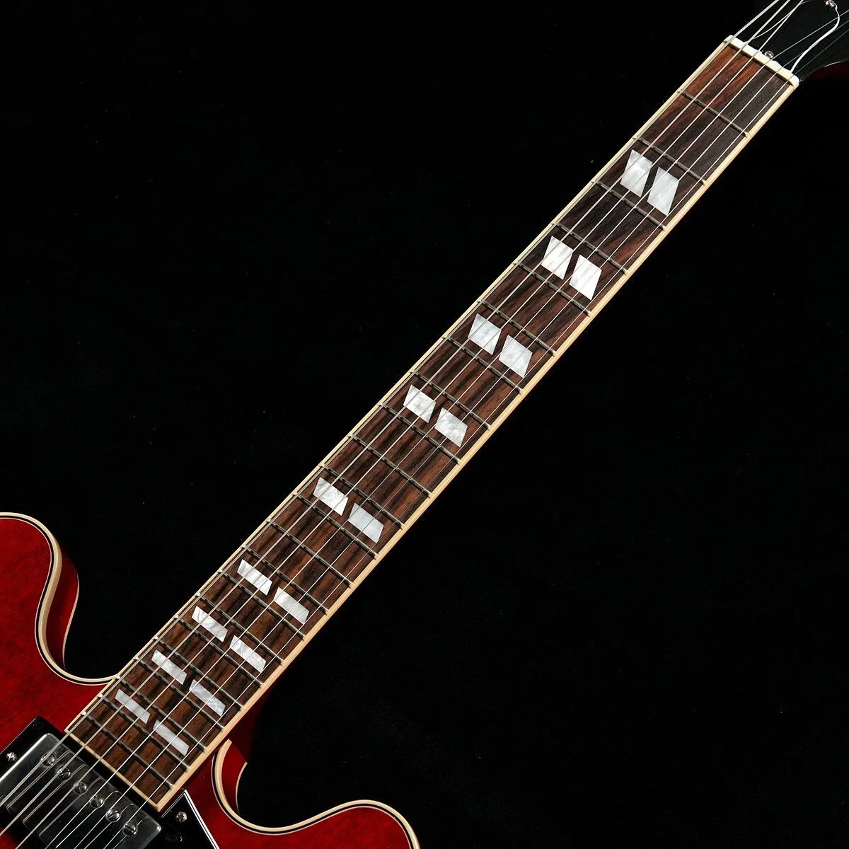 The body is wrapped in multi-layer binding, and the bound fingerboard features split parallelogram inlays, which are exclusive to this model in the ES series.