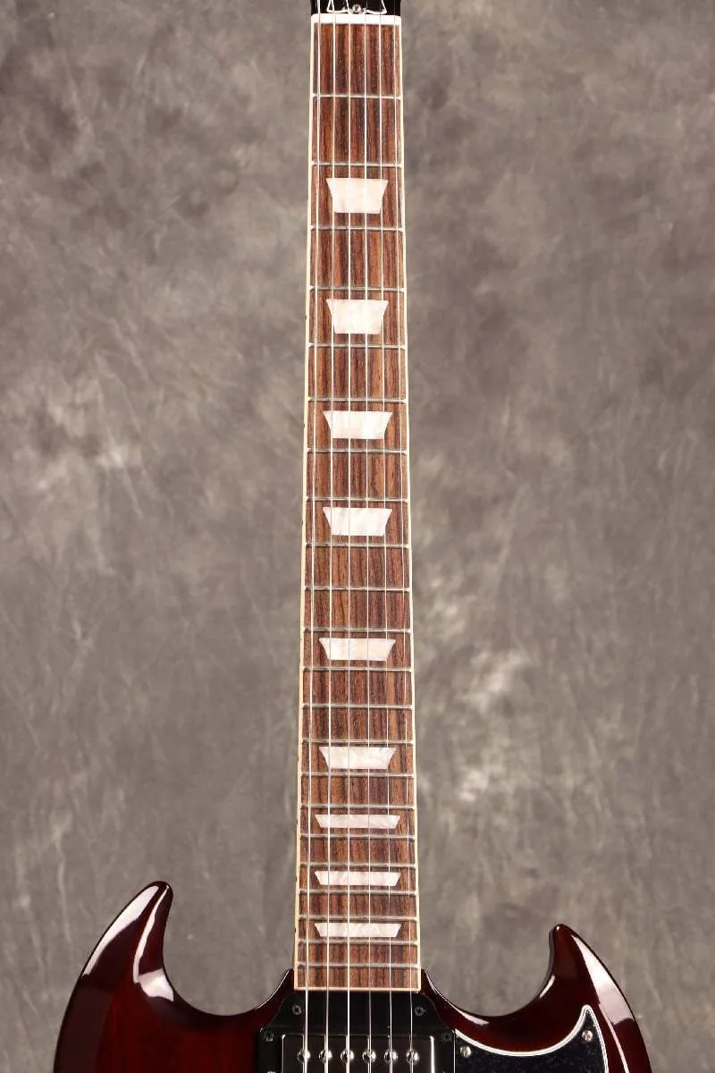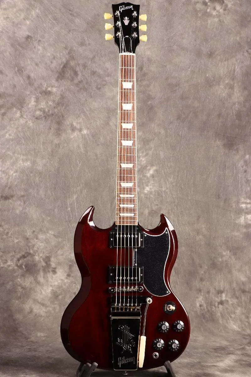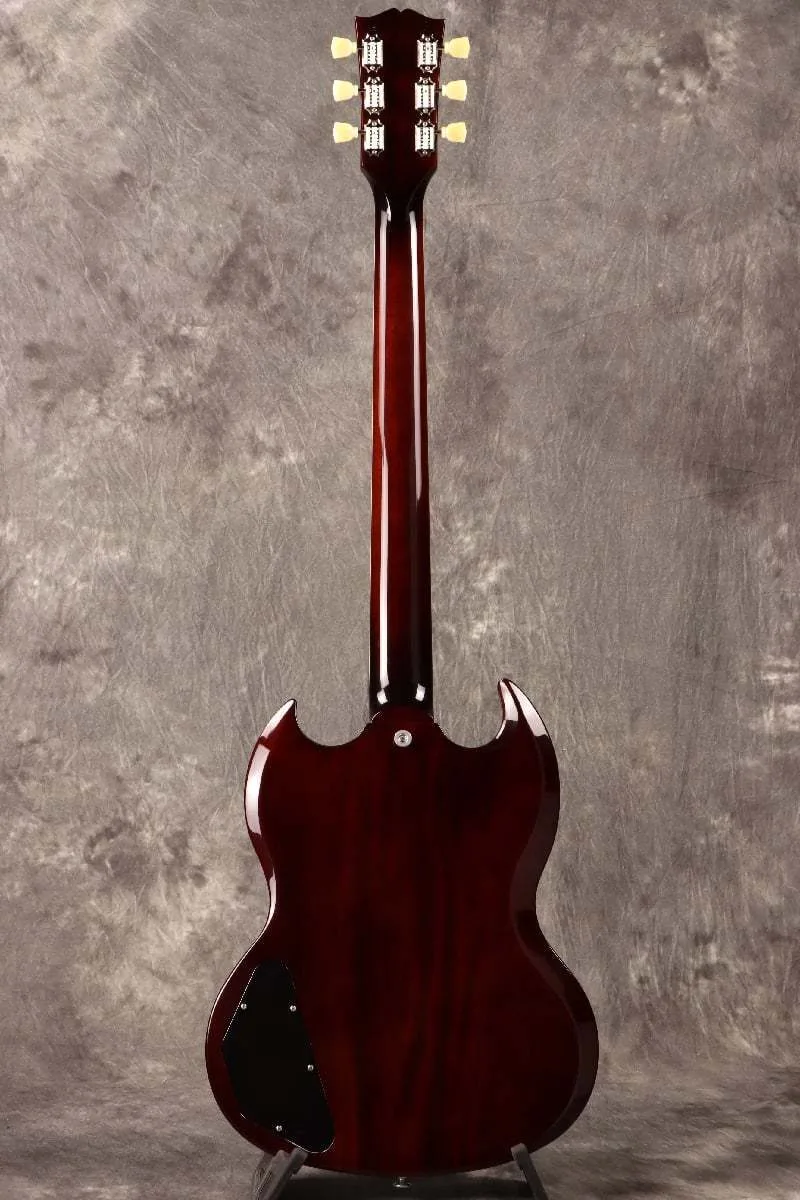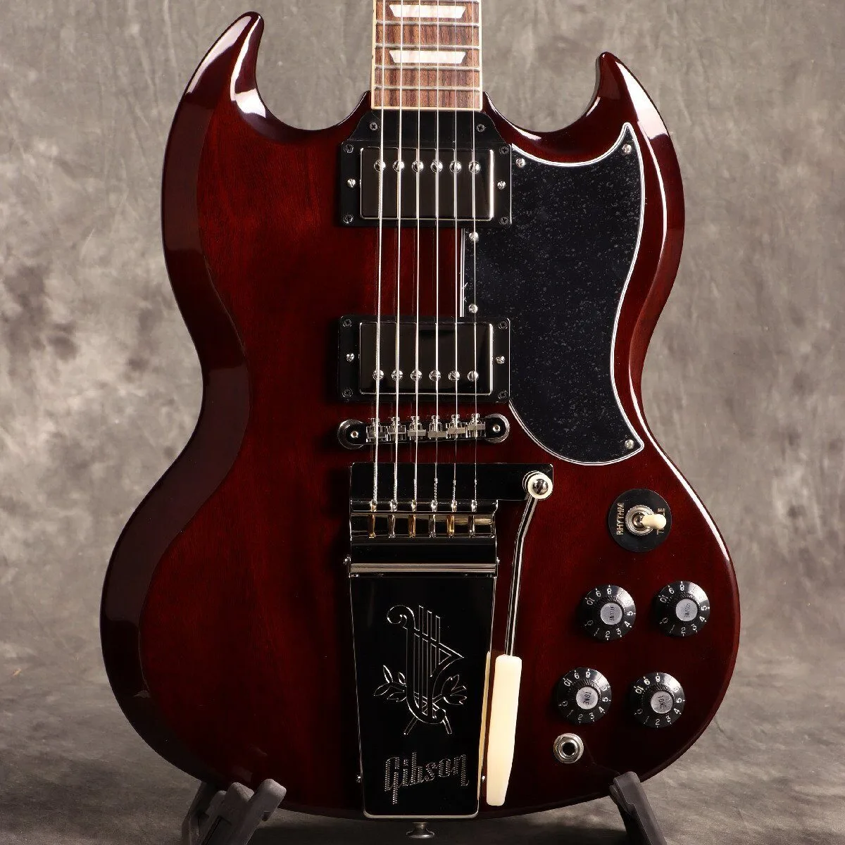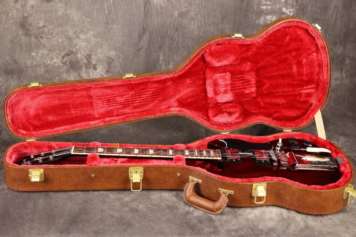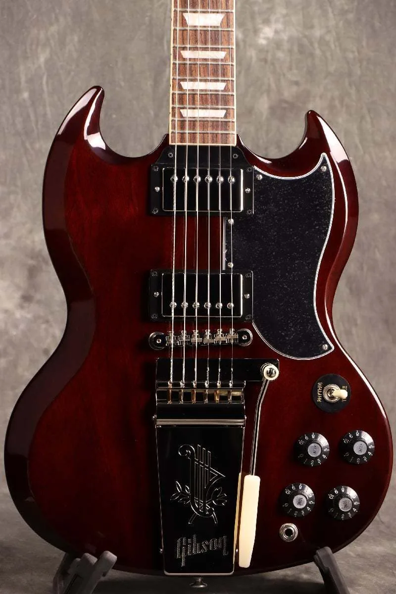 It’s based on the standard SG Standard 61 Maestro Vibrola, but features T-type pickups, witch hat-style control knobs, and an aged cherry body finish! Its