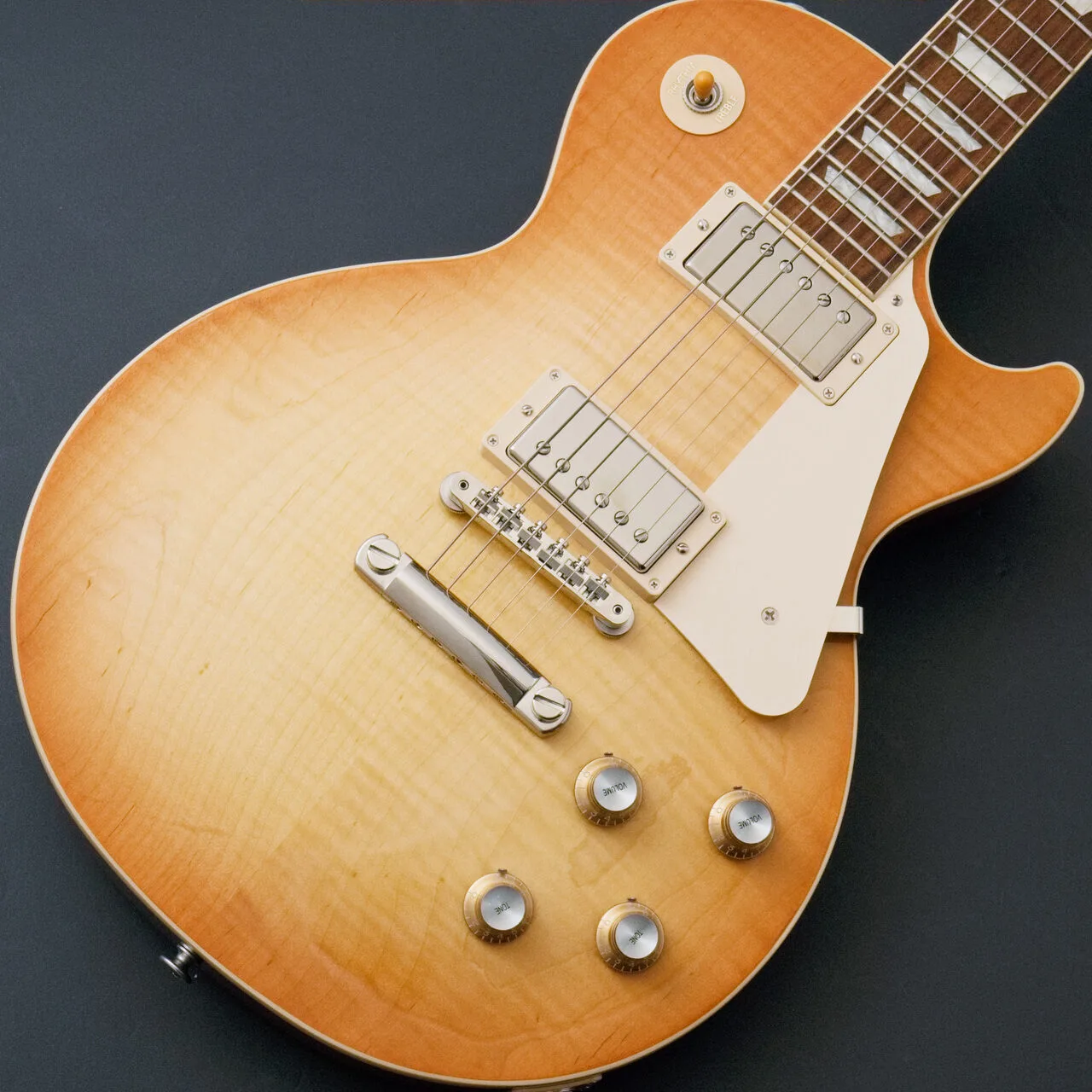 This particular guitar boasts relatively pronounced wood grain, perfectly matching the subdued unburst finish.