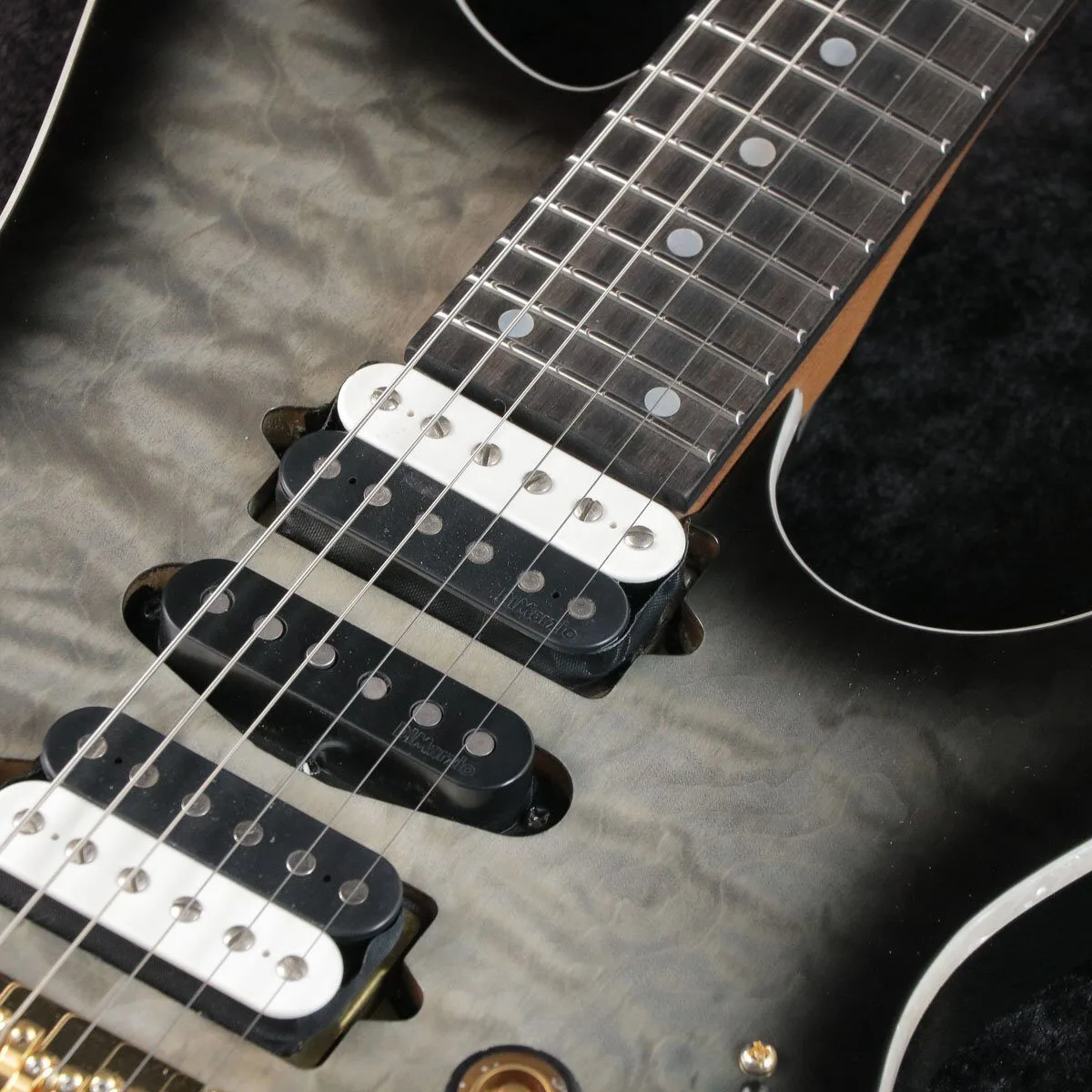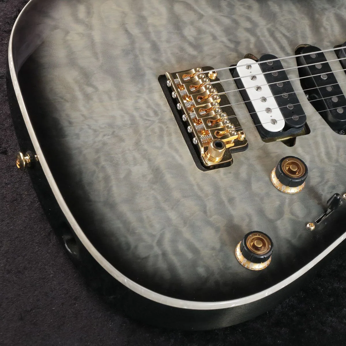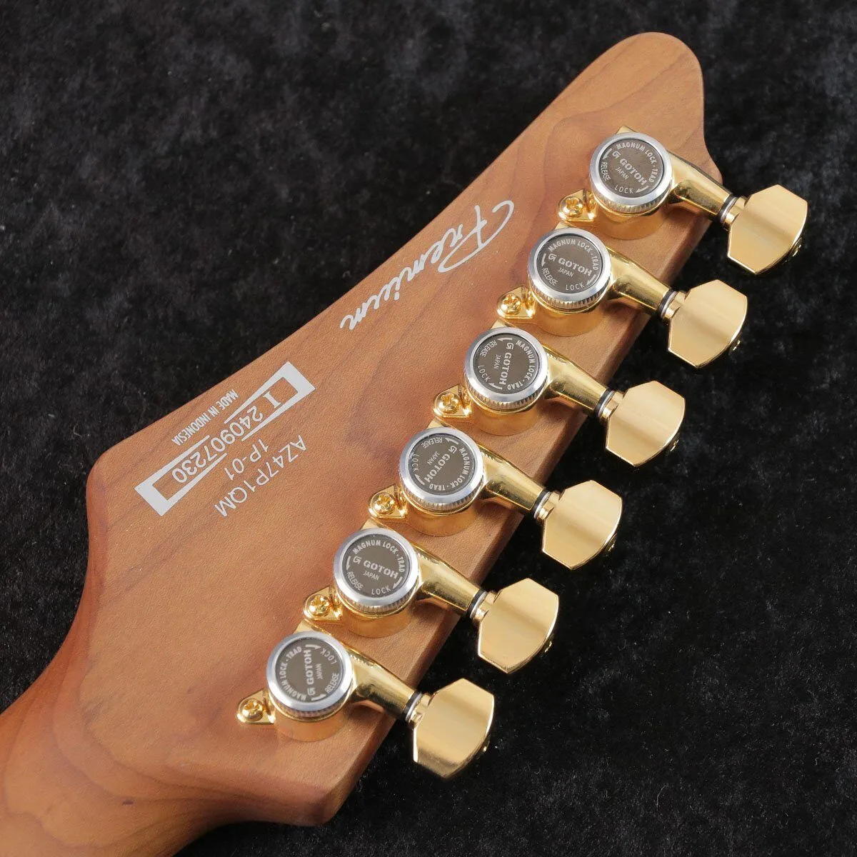 a quilted maple body top, matching headstock, body binding, and gold hardware for a luxurious look. Features include Gotoh MG-T locking machine heads, a roasted maple neck and ebony fingerboard, an AZ-exclusive Oval C neck shape, a Super All Access neck joint, and a custom-designed body contour. Stainless steel frets, luminescent fingerboard side dot position inlays, DiMarzio pickups in an HSH layout, an Ibanez T1502 tremolo bridge with steel saddles (Gotoh) , and a Graph Tech nut . Includes: Original gig case, tremolo arm, and manufacturer’s warranty and instruction manual