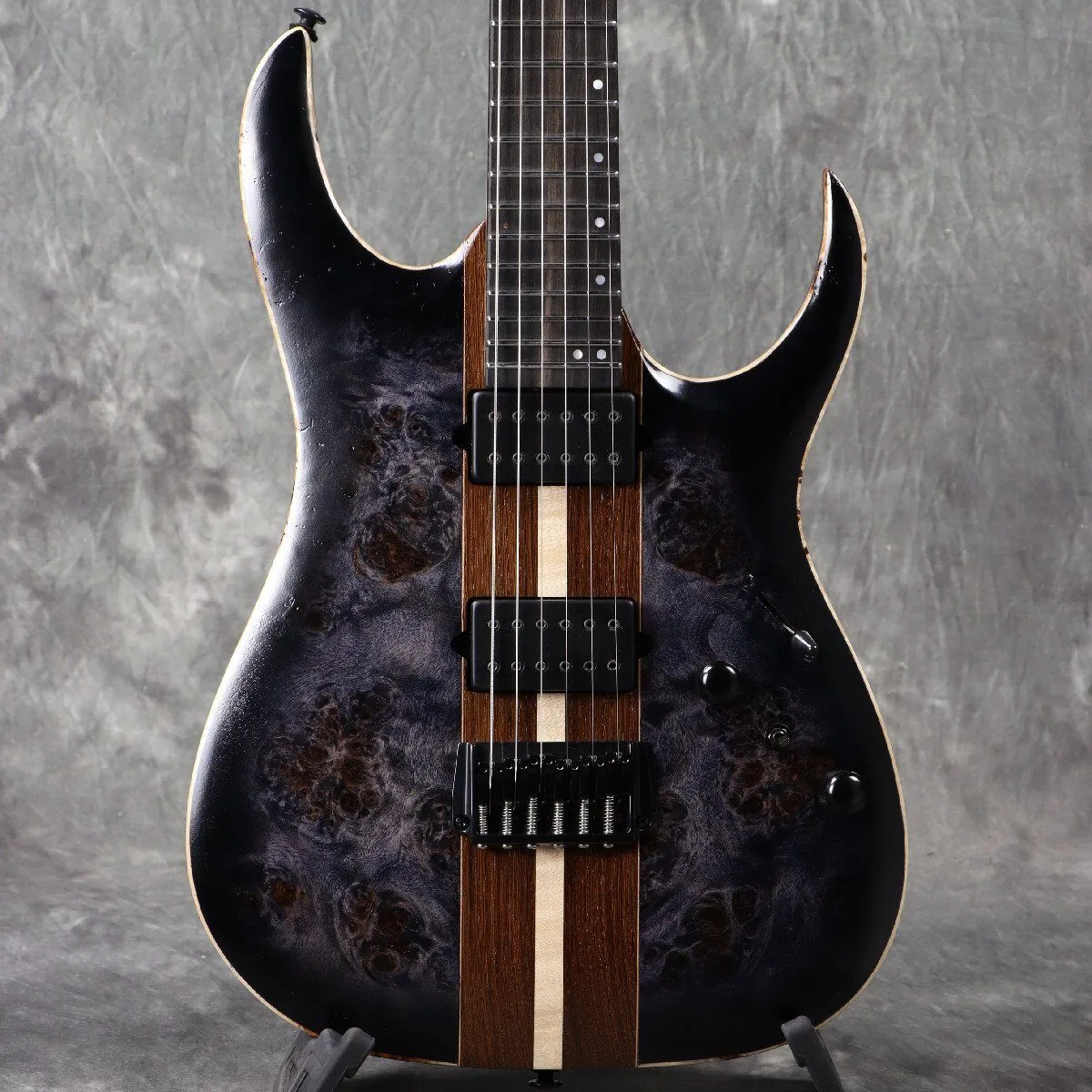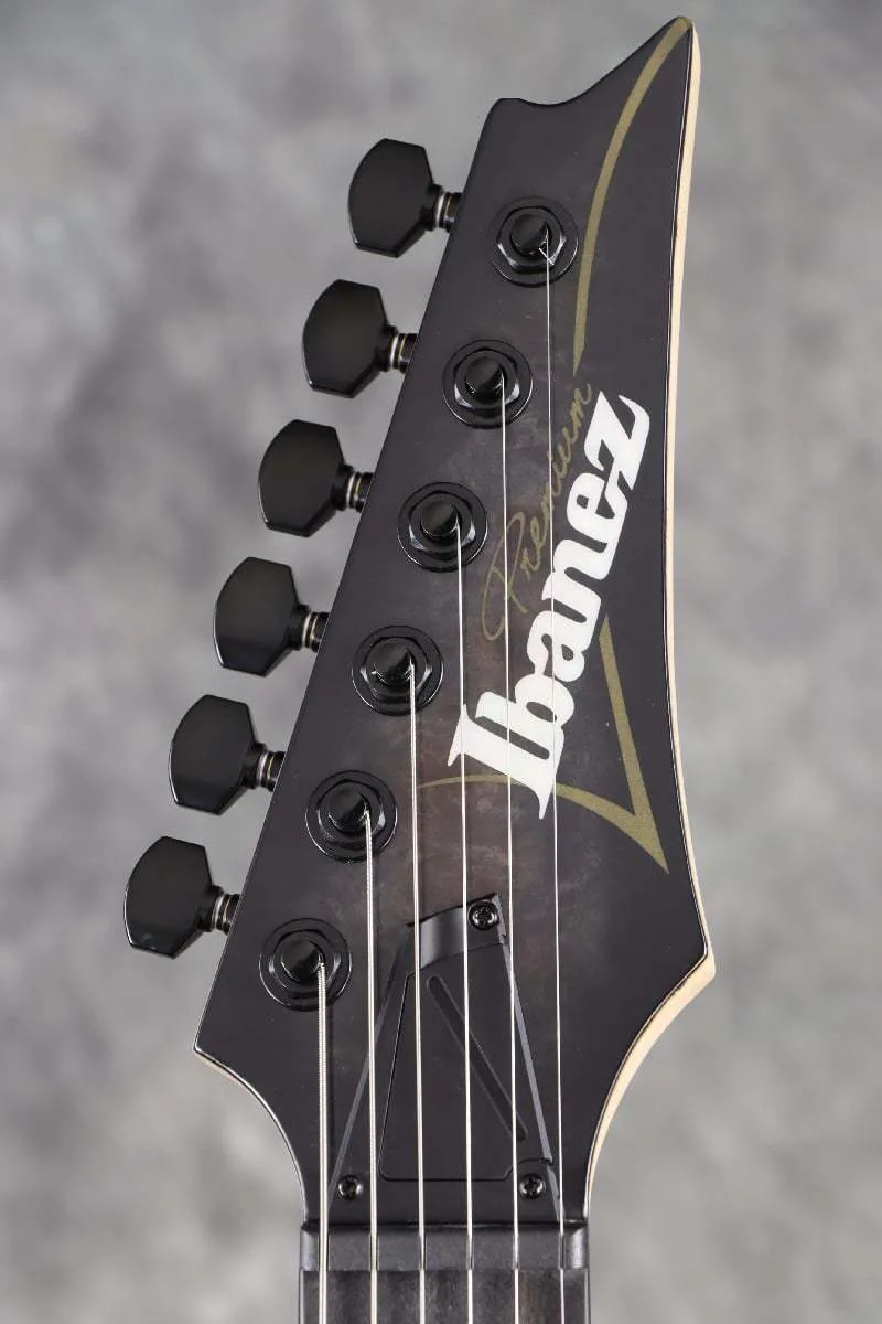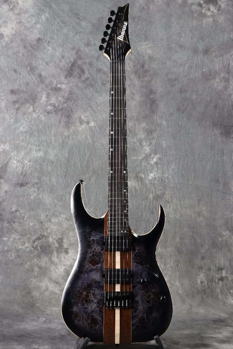 This new RGA model features an eye-catching laminate body top and a black-based Deep Twilight Burst low-gloss finish, creating a modern and luxurious impression. Features include a Poplar Burl/Walnut/Maple/Panga Panga/Curly Maple (17mm thick) laminate body top, a 5-piece Wizard maple/walnut neck, an ebony fingerboard, luminescent fingerboard side position inlays for easy positioning, even on a dark stage, jumbo-size stainless steel frets with premium fret edge treatment, DiMarzio Fusion Edge pickups, a dyna-MIX10 switching system with Alter Switch, and Gotoh MG-T locking machine heads