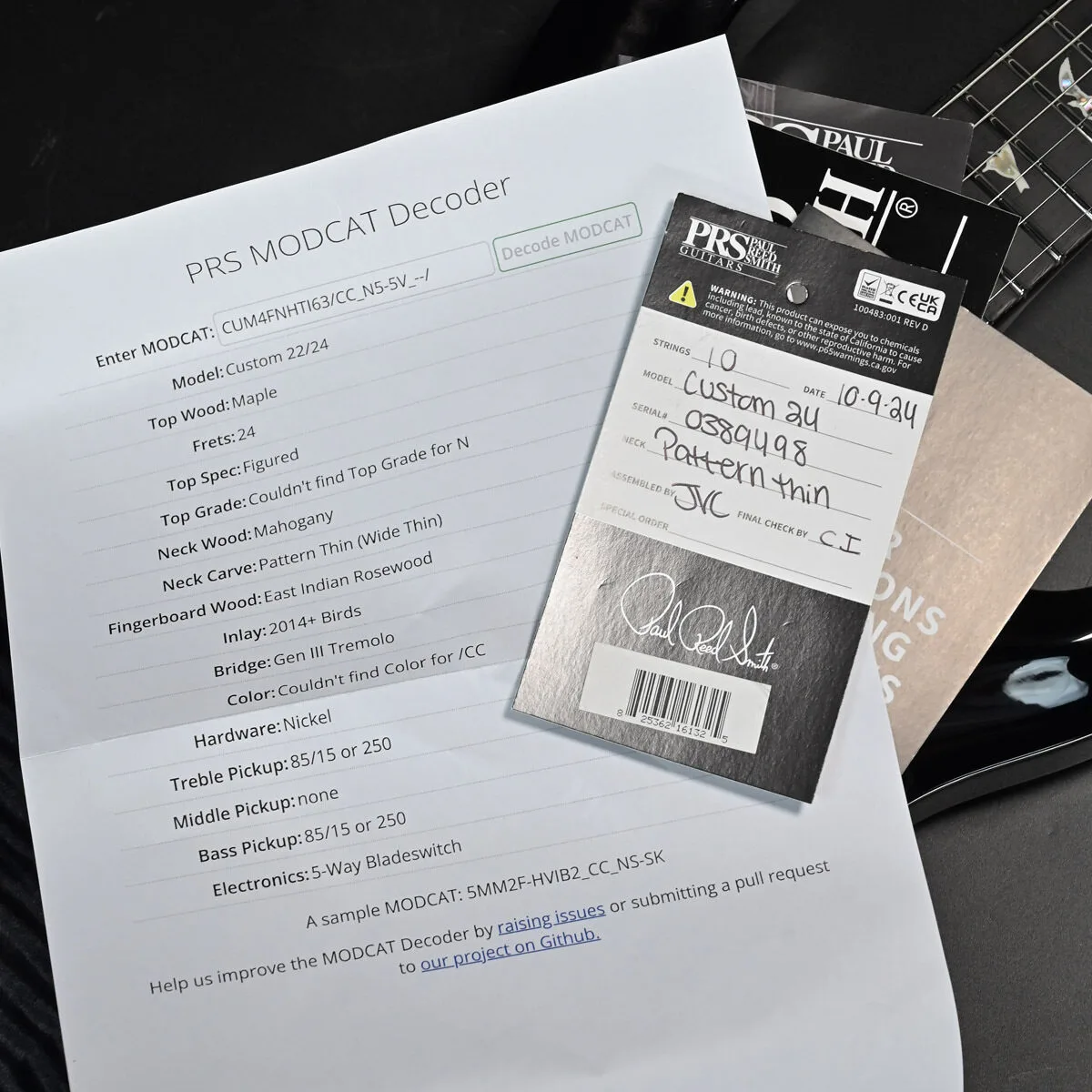 [Main spec details and materials (see PRS Mod Cat Cade)]