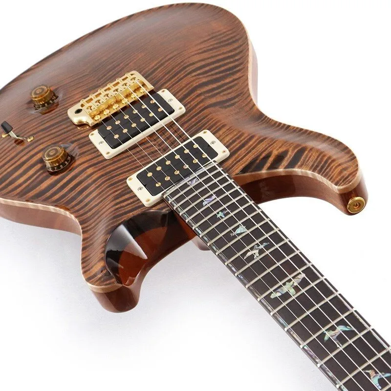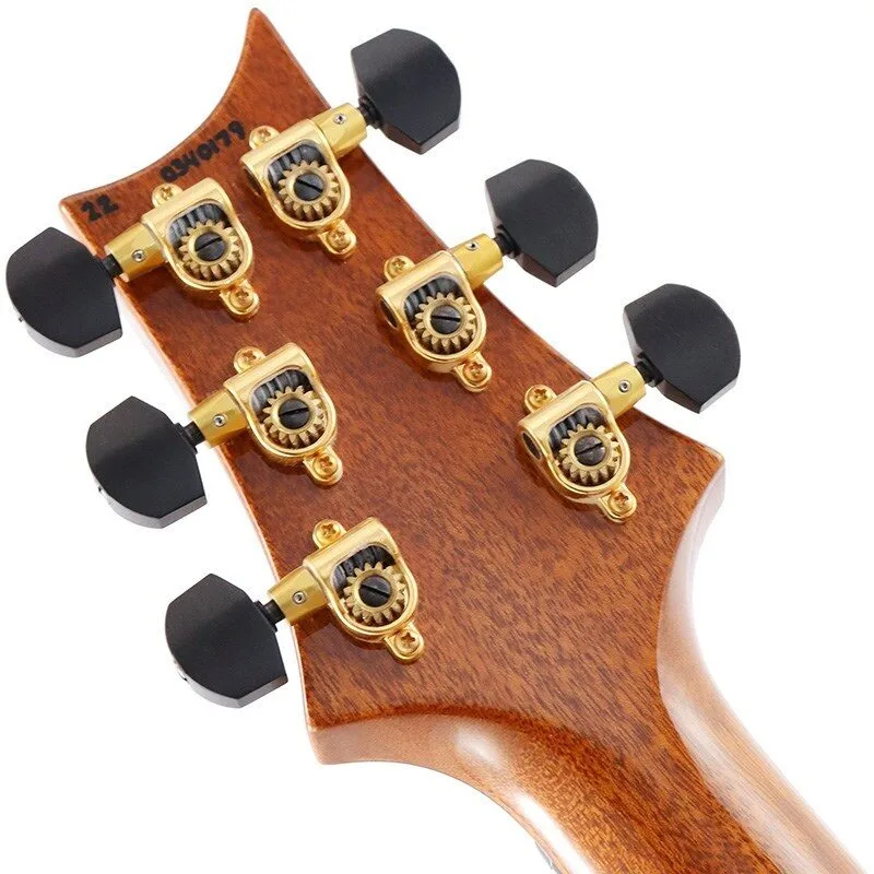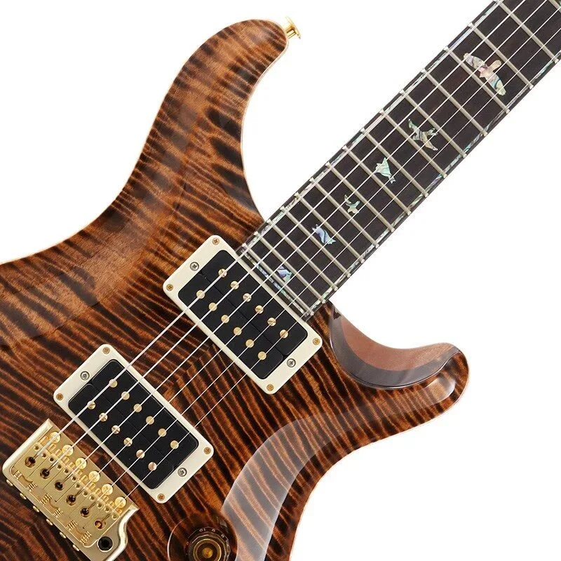 The fingerboard and headstock are crafted from African blackwood. Like rosewood, it is a member of the legume family, the Dalbergia genus. Native to Tanzania, Mozambique, and other parts of Africa, it’s also known as grenadilla. The dark part of this guitar is the heartwood, while the sapwood is yellowish-white. The dark heartwood takes 50 to 60 years to mature, making it extremely rare and highly sought after. Due to its exceptional strength and excellent tone after drying, it has long been used for woodwind instruments such as oboes, flutes, clarinets, and bagpipes. Its tone is closest to Brazilian rosewood, and it is also used for the back and sides of high-quality, handcrafted acoustic guitars. The inlays, one of PRS’s signature features, are a special feature exclusive to the Wood Library, based on the commemorative model.